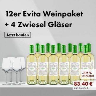 EVITA Trebbiano Pinot Grigio IGT Puglia 2021 12 Flaschen + 4 Weingläser